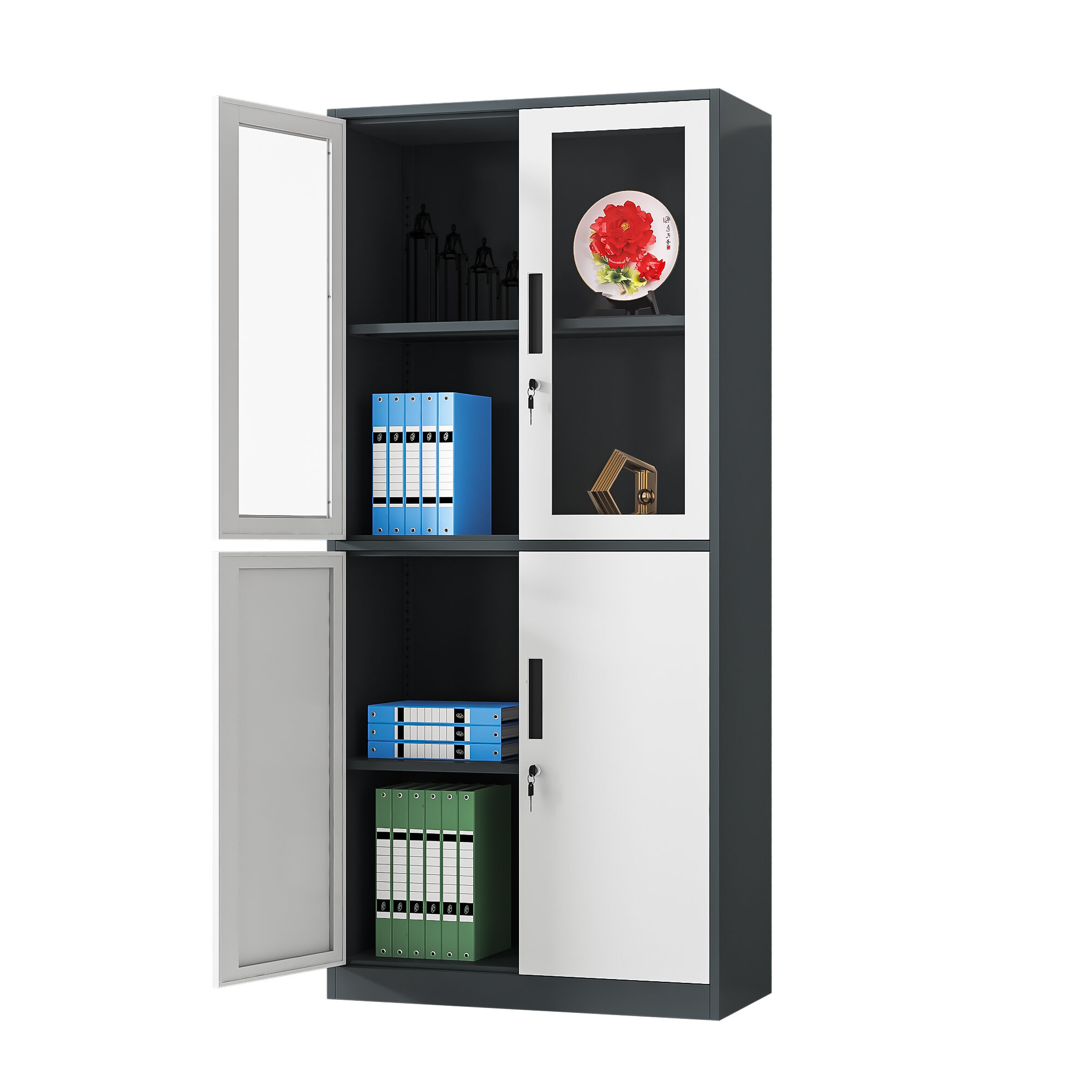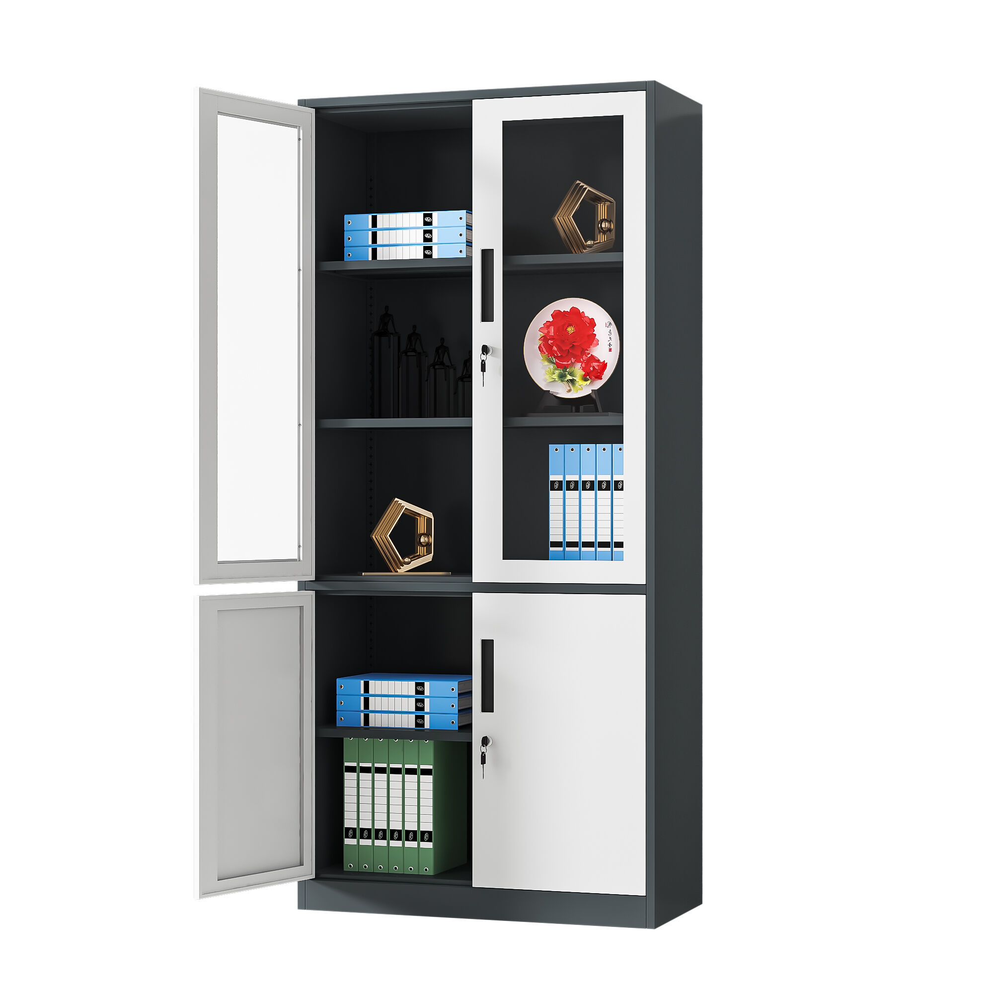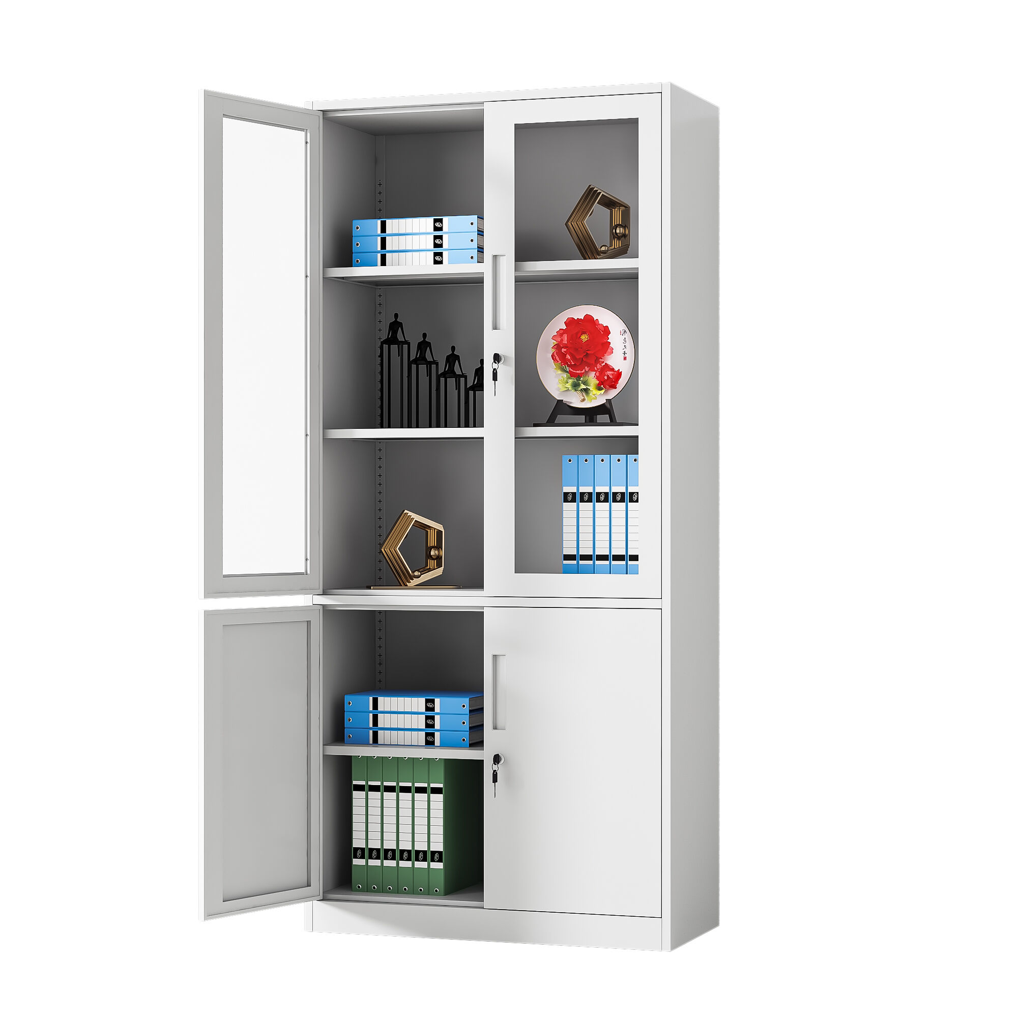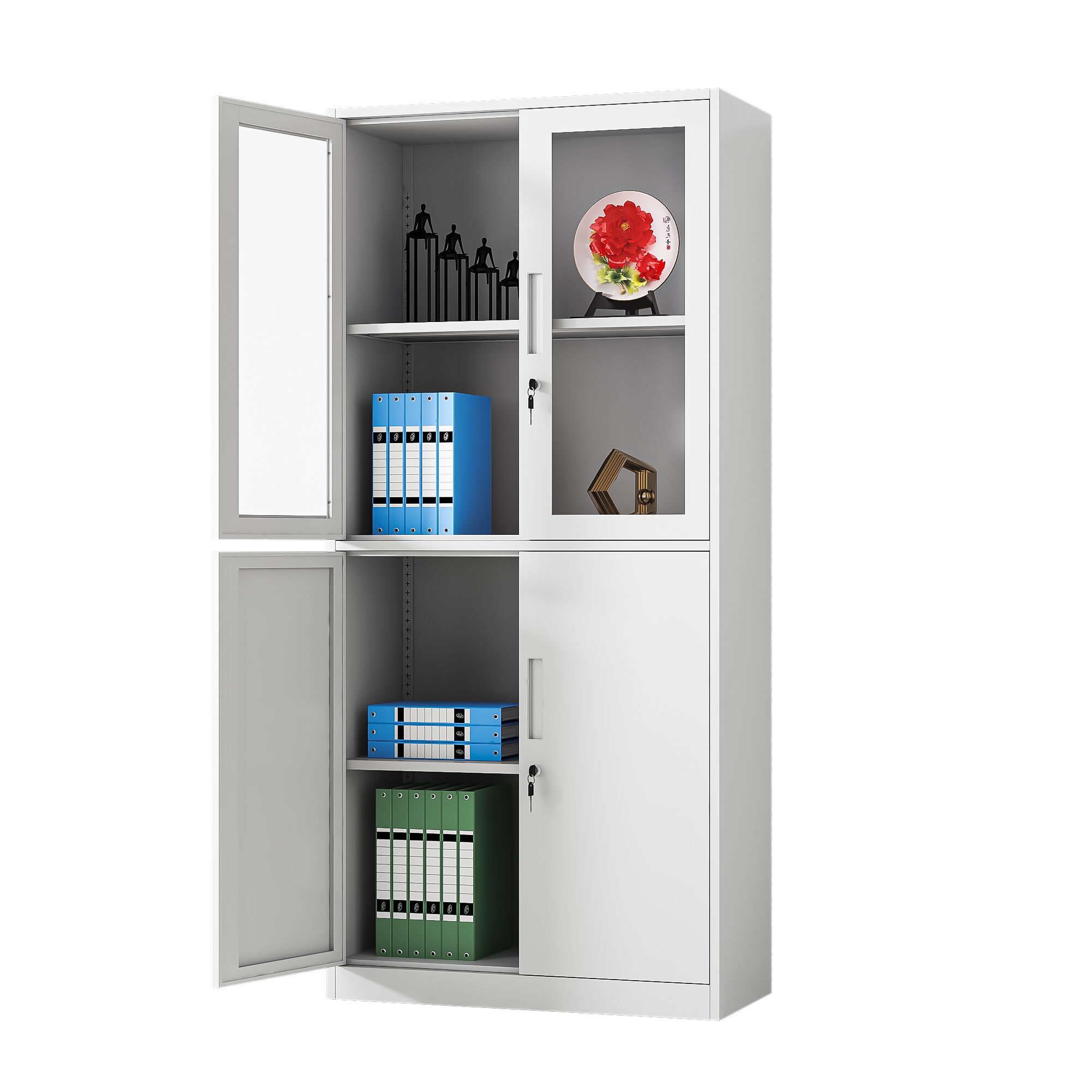 Inside, each compartment is equipped with heavy-duty adjustable steel shelves, rigorously tested to support up to 40 kilograms per shelf—more than enough to handle stacks of thick files or heavy reference books. The shelf adjustment mechanism is intuitive and tool-free, allowing users to reconfigure the space in seconds to adapt to changing storage needs. Security is a top priority, with independent locking systems for each door set, each equipped with high-quality brass locks and a pair of anti-duplication keys. The locking mechanism operates smoothly with minimal effort, designed to withstand repeated use without wear or failure, providing peace of mind for storing confidential materials.