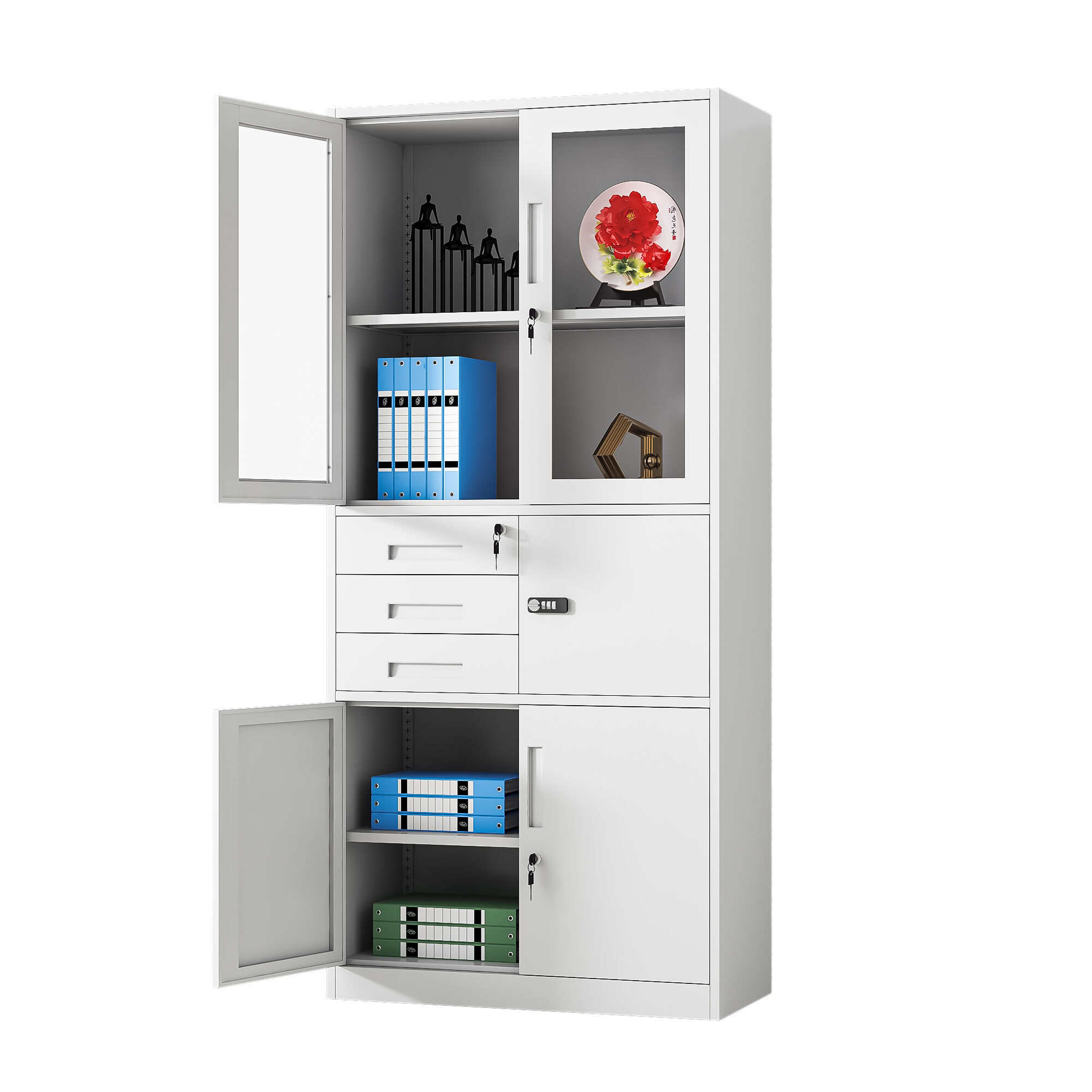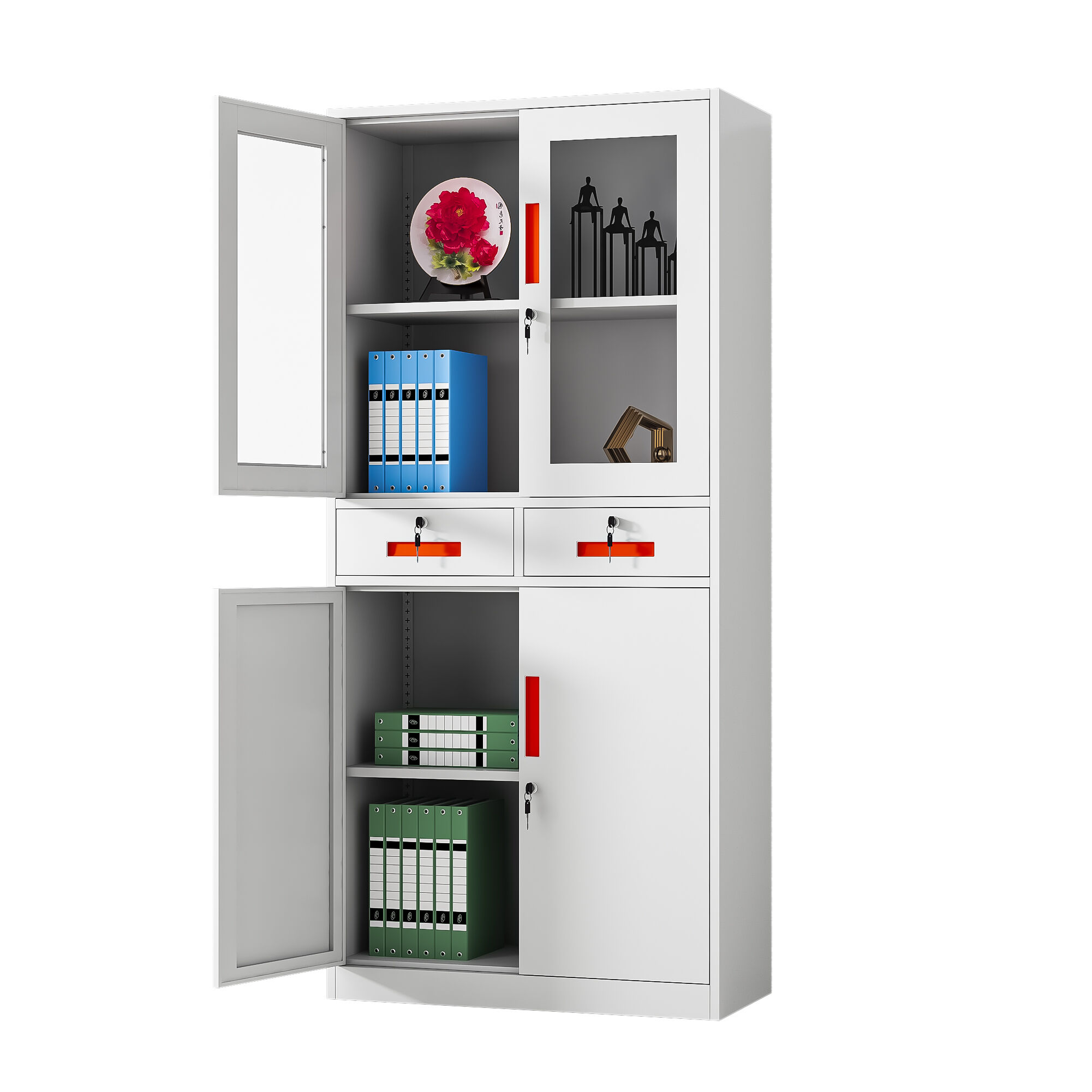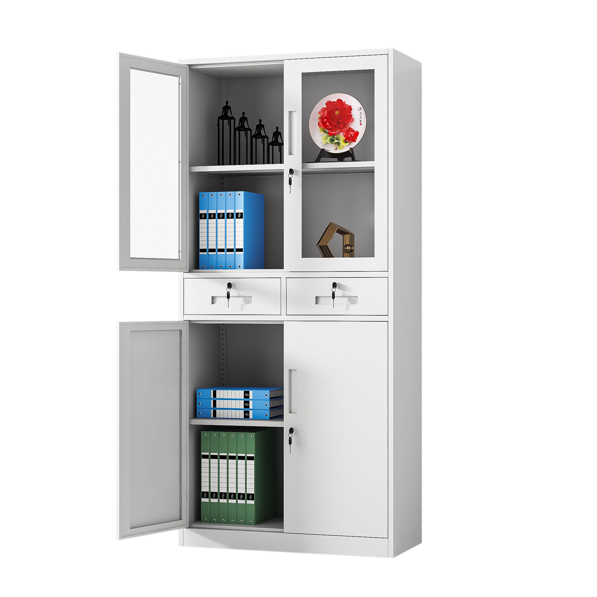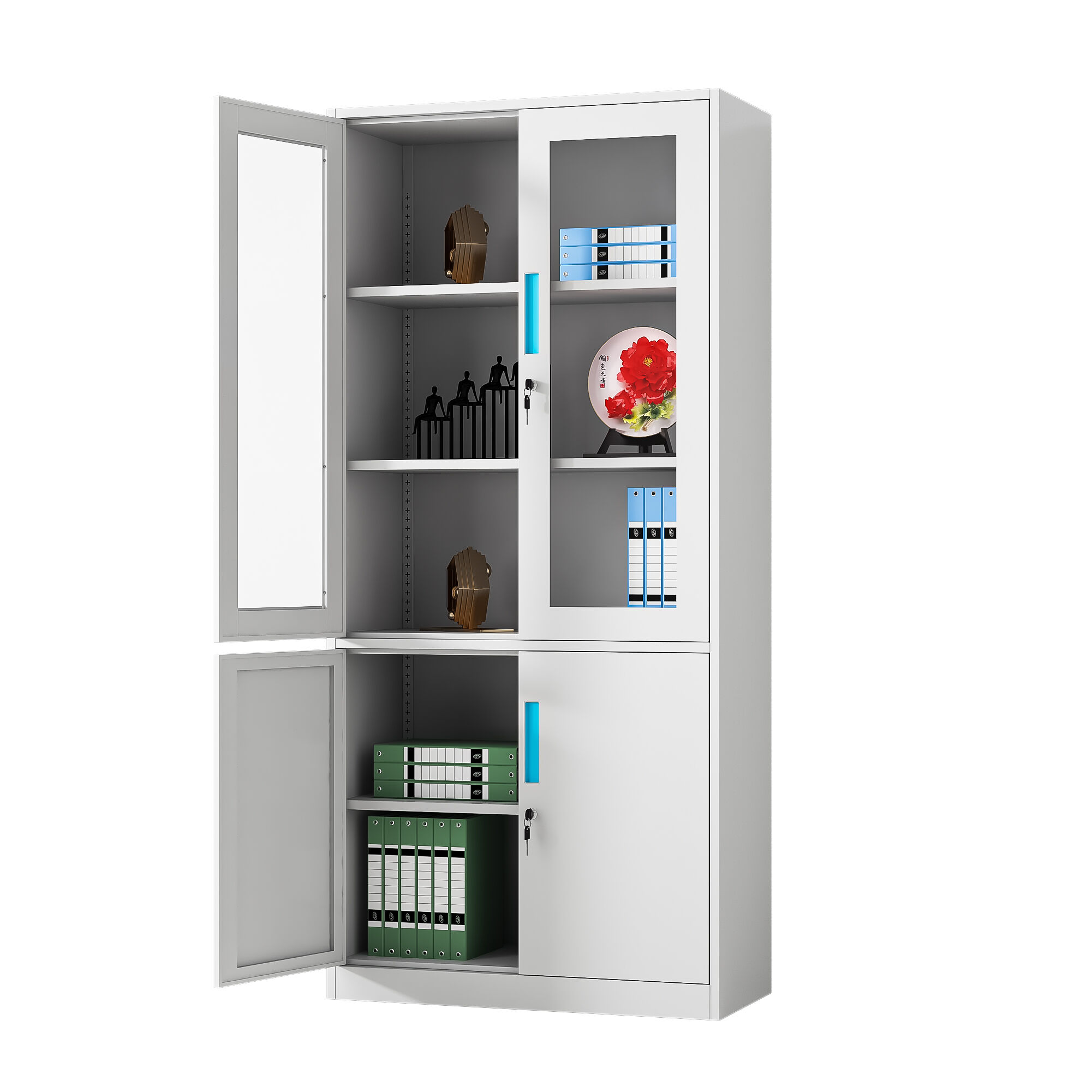 Inside, each compartment is equipped with heavy-duty adjustable steel shelves, rigorously tested to support up to 40 kilograms per shelf—more than enough to handle stacks of thick files or heavy reference books. The shelf adjustment mechanism is intuitive and tool-free, allowing users to reconfigure the space in seconds to adapt to changing storage needs. Security is a top priority, with independent locking systems for each door set, each equipped with high-quality brass locks and a pair of anti-duplication keys. The locking mechanism operates smoothly with minimal effort, designed to withstand repeated use without wear or failure, providing peace of mind for storing confidential materials.