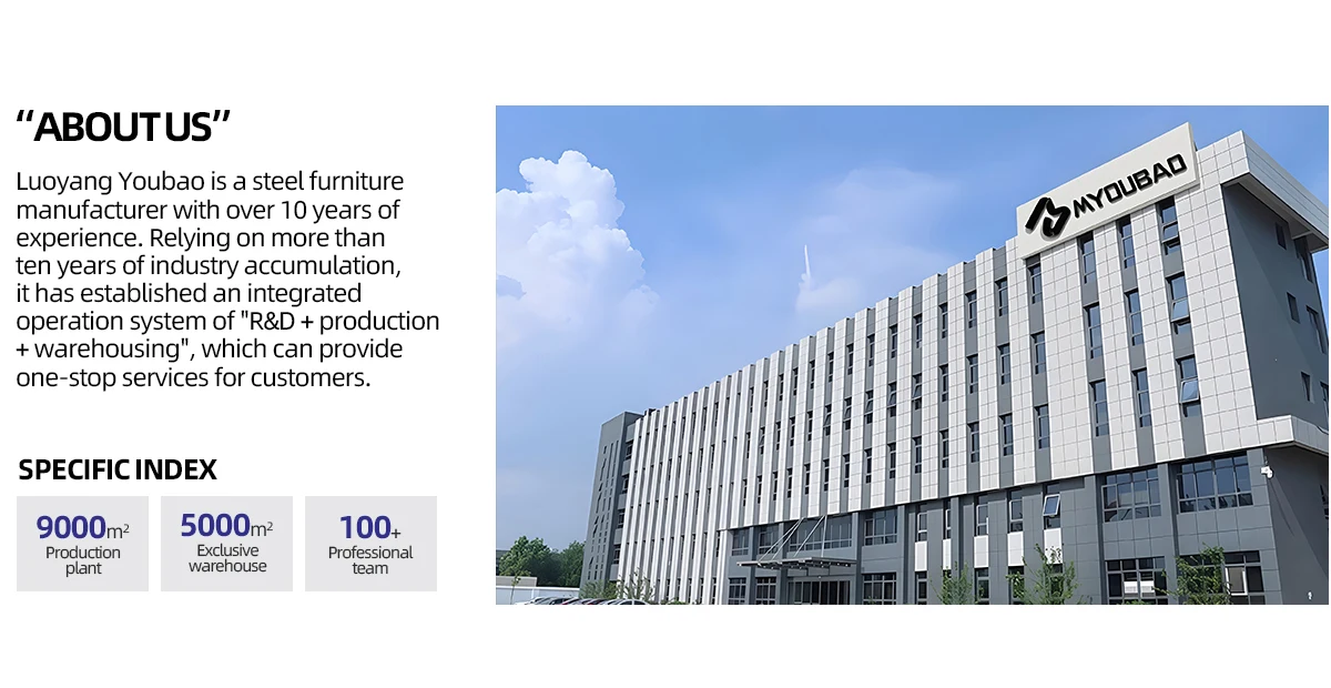Luoyang Youbao Office Furniture Co., Ltd., brand name MYOUBAO, is a professional modern manufacturer dedicated to mid-to-high-end office furniture, specializing in the R&D, production, and sales of steel, steel-wood, and smart filing cabinets. With a focus on integrating technology and practicality, we have established a complete industrial chain from raw material procurement to finished product delivery, ensuring consistent quality across every link.